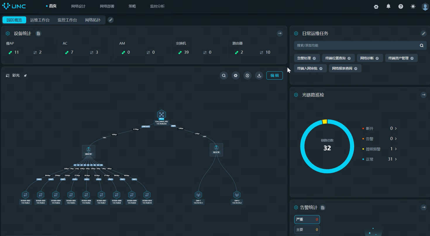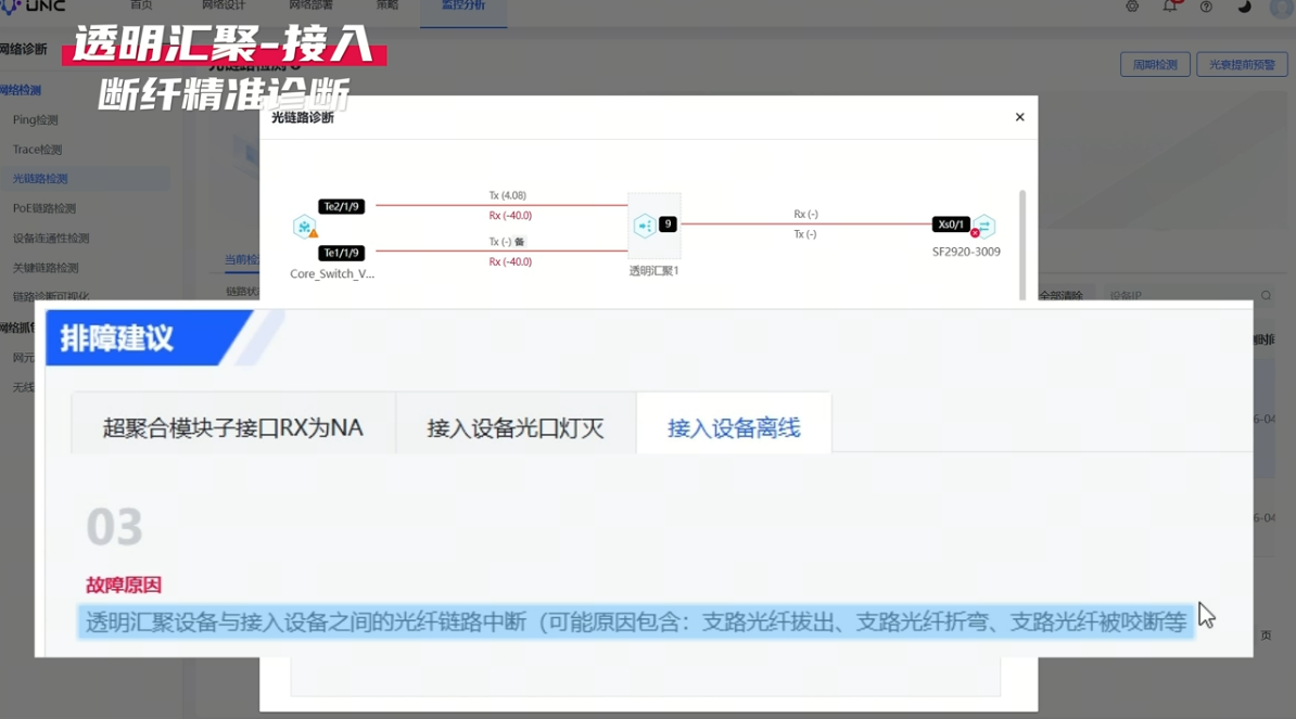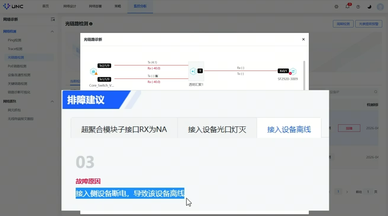 传统方案排查网线故障需要跑两端、拿测线仪逐段检测,耗时耗力。UNC平台支持链路诊断免现场 ,自动定位定界。